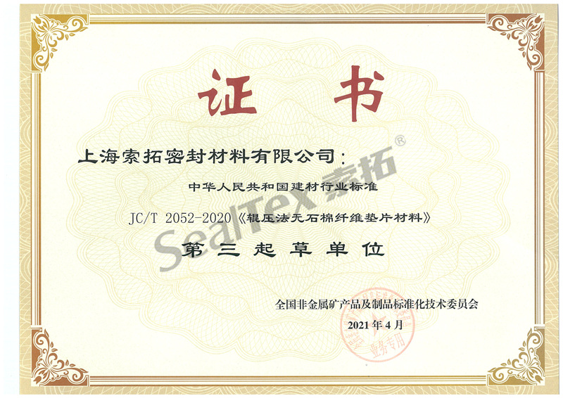 我司參與起草JC/T2052《輥壓法無石棉纖維墊片材料》標(biāo)準(zhǔn) 上海索拓密封材料有限公司(以下簡稱“我司”)參與起草了JC/T 2052-2020《輥壓法無石棉纖維墊片材料》標(biāo)準(zhǔn) 是JC/T 2052-2020《輥壓法無石棉纖維墊片材料》標(biāo)準(zhǔn)的第三起草單位。 上一個 返回列表 下一個