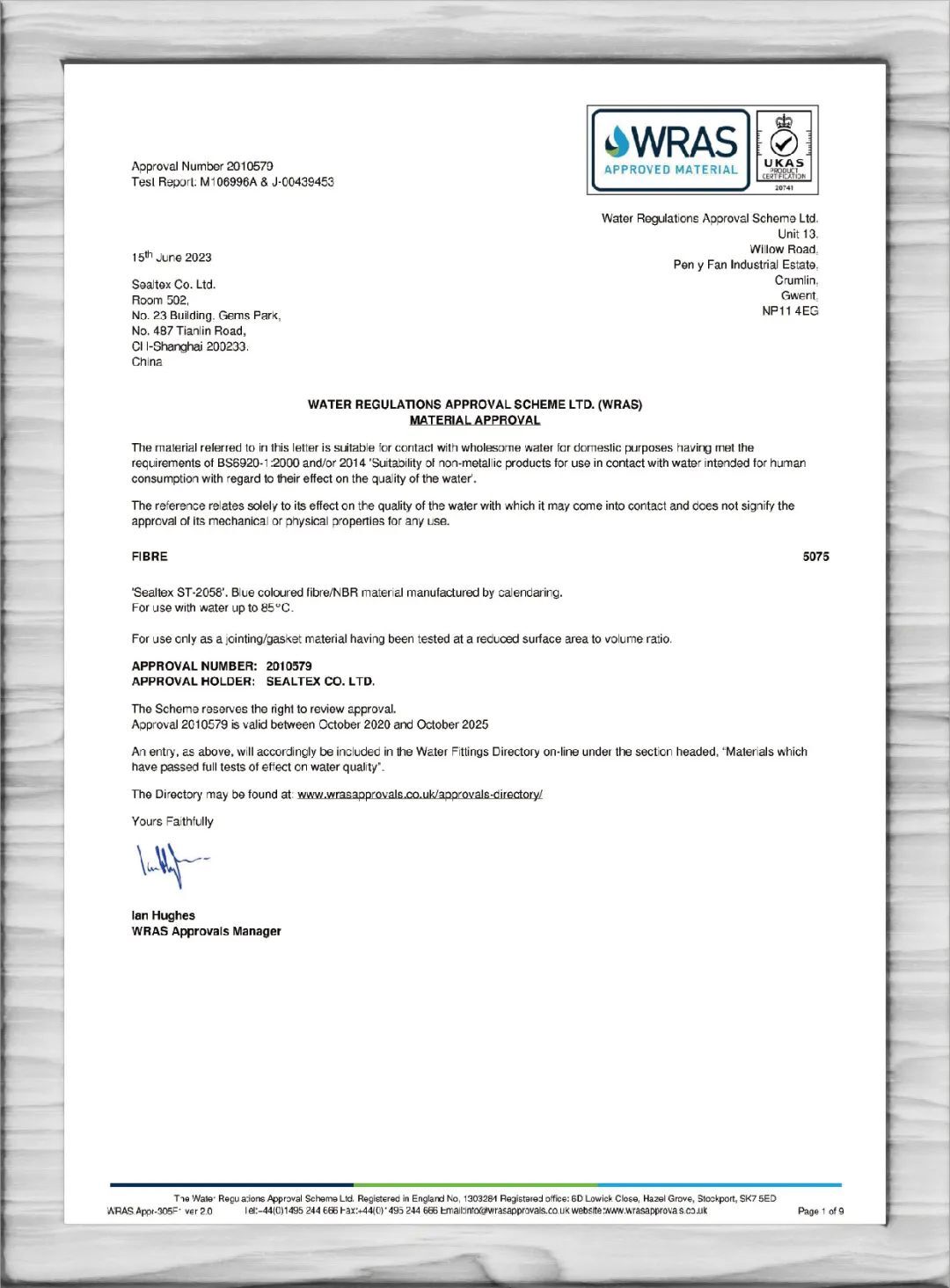 SealTex索拓ST-2058無石棉密封材料通過WRAS(Water Research Advisory Scheme)認(rèn)證。