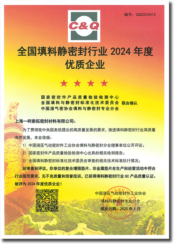上海一柯索拓密封材料有限公司榮膺"全國(guó)填料靜密封行業(yè)2024年度優(yōu)質(zhì)企業(yè)"稱號(hào),以創(chuàng)新密封技術(shù)驅(qū)動(dòng)產(chǎn)業(yè)未來(lái)。