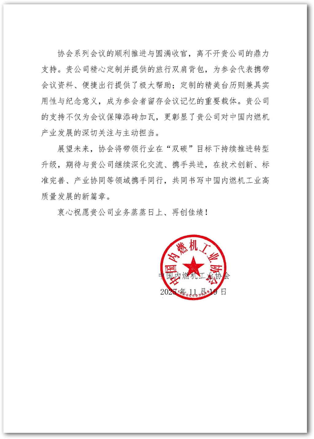來自中國內(nèi)燃機(jī)工業(yè)協(xié)會(huì)的感謝信 近日,我司收到來自中國內(nèi)燃機(jī)工業(yè)協(xié)會(huì)的感謝信,也借此機(jī)會(huì)感謝協(xié)會(huì)的多年信任和支持,作為會(huì)員我們一直全力盡責(zé)盡職并很榮幸作為其中一員推動(dòng)協(xié)會(huì)和行業(yè)的發(fā)展。并再次祝賀大會(huì)的成功召開。 上一個(gè) 返回列表 下一個(gè)