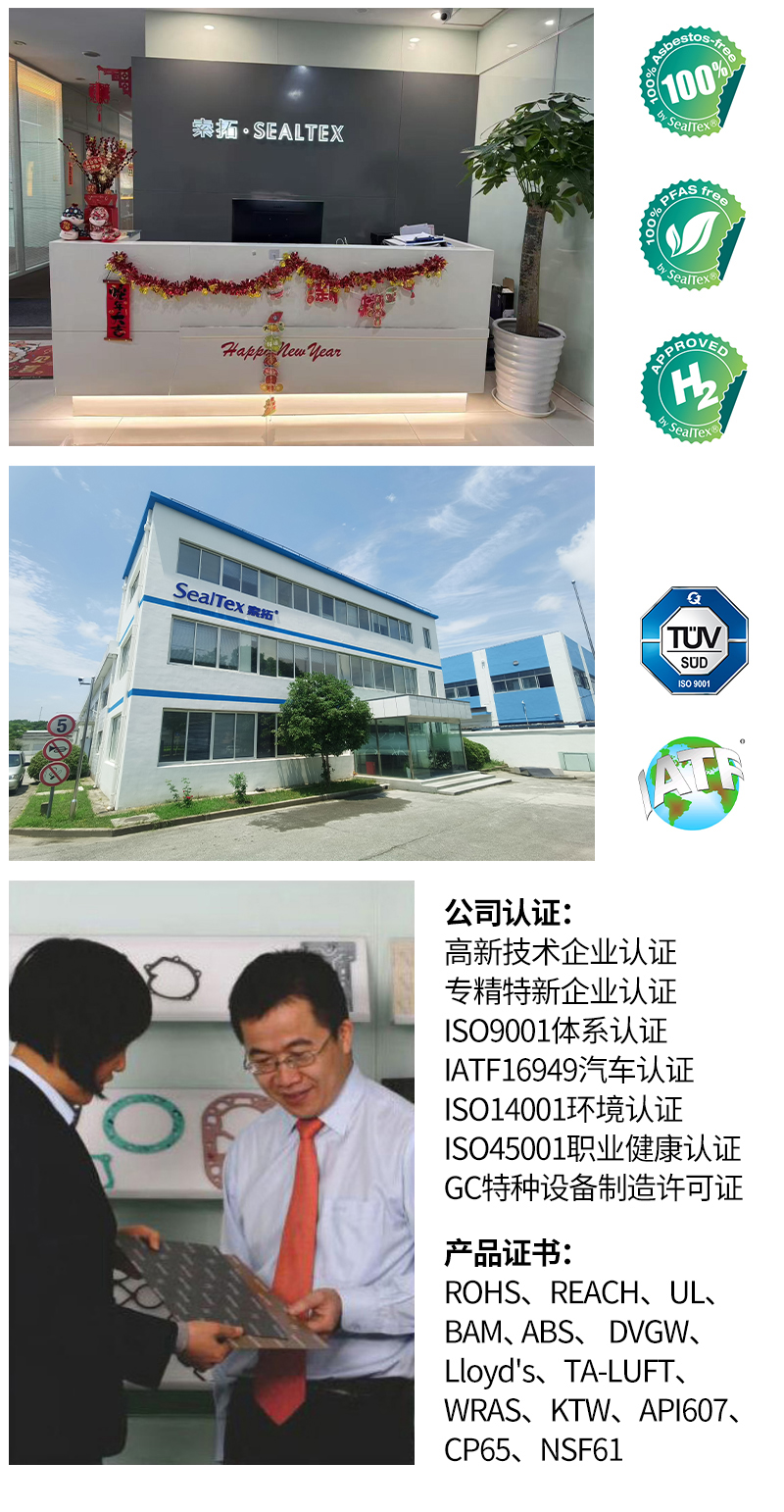 SealTex索拓密封可提供各種膨體四氟及改性四氟密封墊、壓縮纖維橡膠密封墊、軟木橡膠密封墊、石墨金屬復合增強墊片、植物纖維耐油紙墊、耐高溫云母復合密封墊、金屬涂覆密封墊RCM等。常見材料型號ST-2067、ST-4376、ST-2058、ST-3150、ST-9926、ST-3263等廣泛應用于汽車、暖通空調(diào)、造船、海工、石油化工、核電、醫(yī)藥食品、新能源等各種工業(yè)領域。并有RoHS、REACH、UL、SVGW、DVGW、TSCA、CP65、ELV、PFAS-free、EN45545-2、FDA、BAM、TA-Luft、API607、ABS、GL、WRAS、NSF61、ACS、KTW、ELL、KTW-BWGL、TZW W270、FIRE-SAFE防火認證等證書。可提供API622、ISO15848-1及FDA認證的盤根填料;各種盤根及墊片切割工具。提供各種特殊尺寸的輥壓板如2000X2000mm、3000X3000mm、1500X4500m。密封墊厚度從0.15mm起.
