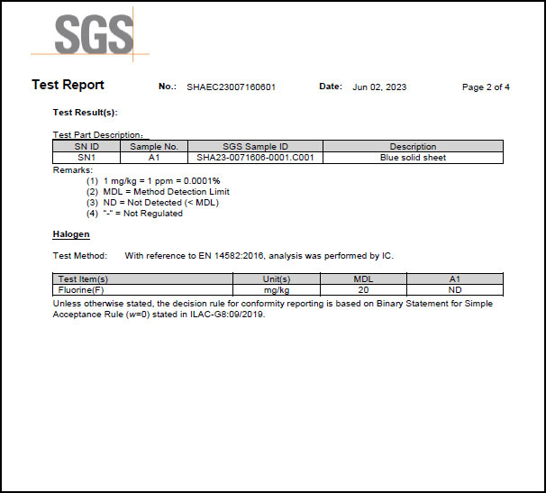 為滿足客戶需求,近日SealTex索 ST-2058無(wú)石棉板通過(guò)了SGS進(jìn)行的鹵素(氟)檢測(cè),檢測(cè)標(biāo)準(zhǔn)EN 14582-2016,報(bào)告顯示未測(cè)出氟,報(bào)告部分截圖如下: