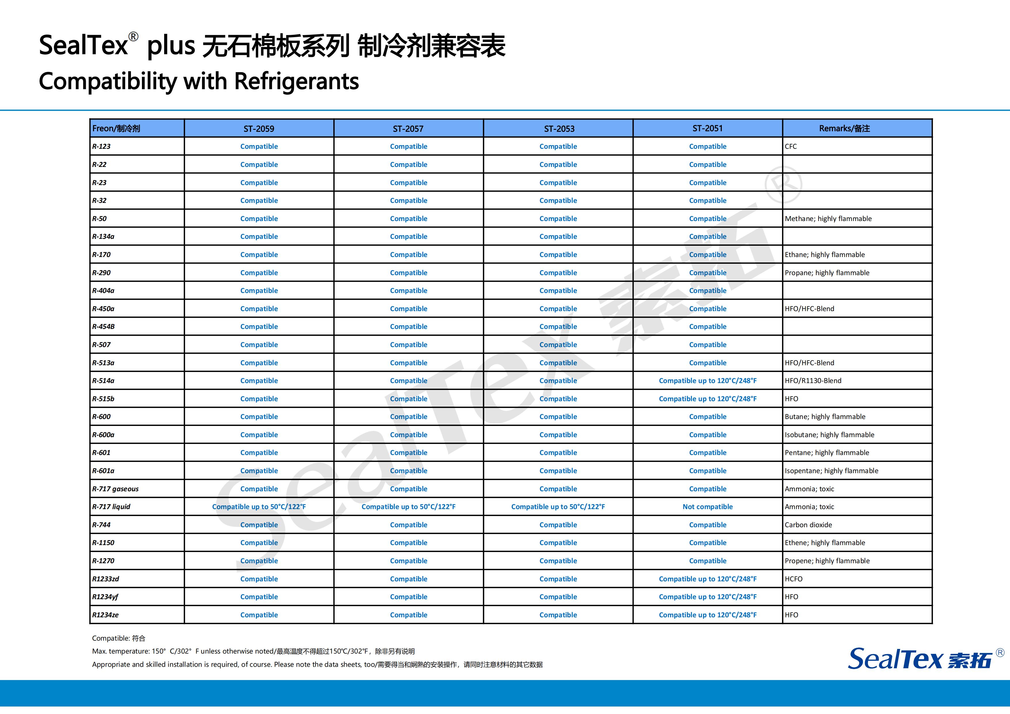 對(duì)于密封式和半密封式制冷壓縮機(jī)來(lái)說(shuō),每類制冷壓縮機(jī)可能會(huì)用到不同的制冷劑,一個(gè)能完全遏止制冷劑的可靠性密封系統(tǒng)是決定壓縮機(jī)長(zhǎng)期穩(wěn)定運(yùn)轉(zhuǎn)的重要因素。SealTex索拓公司為滿足制冷壓縮機(jī)用戶的要求,特別推出能在各種法蘭壓力下保持卓越密封性能的無(wú)石棉密封材料以滿足市場(chǎng)的需求。這些產(chǎn)品非常適用于半密封式壓縮機(jī)、冷卻裝置,對(duì)螺桿式和往復(fù)式壓縮機(jī)的應(yīng)用尤其適合。例如:ST-2059ST-2057、ST-2053、ST-2051.