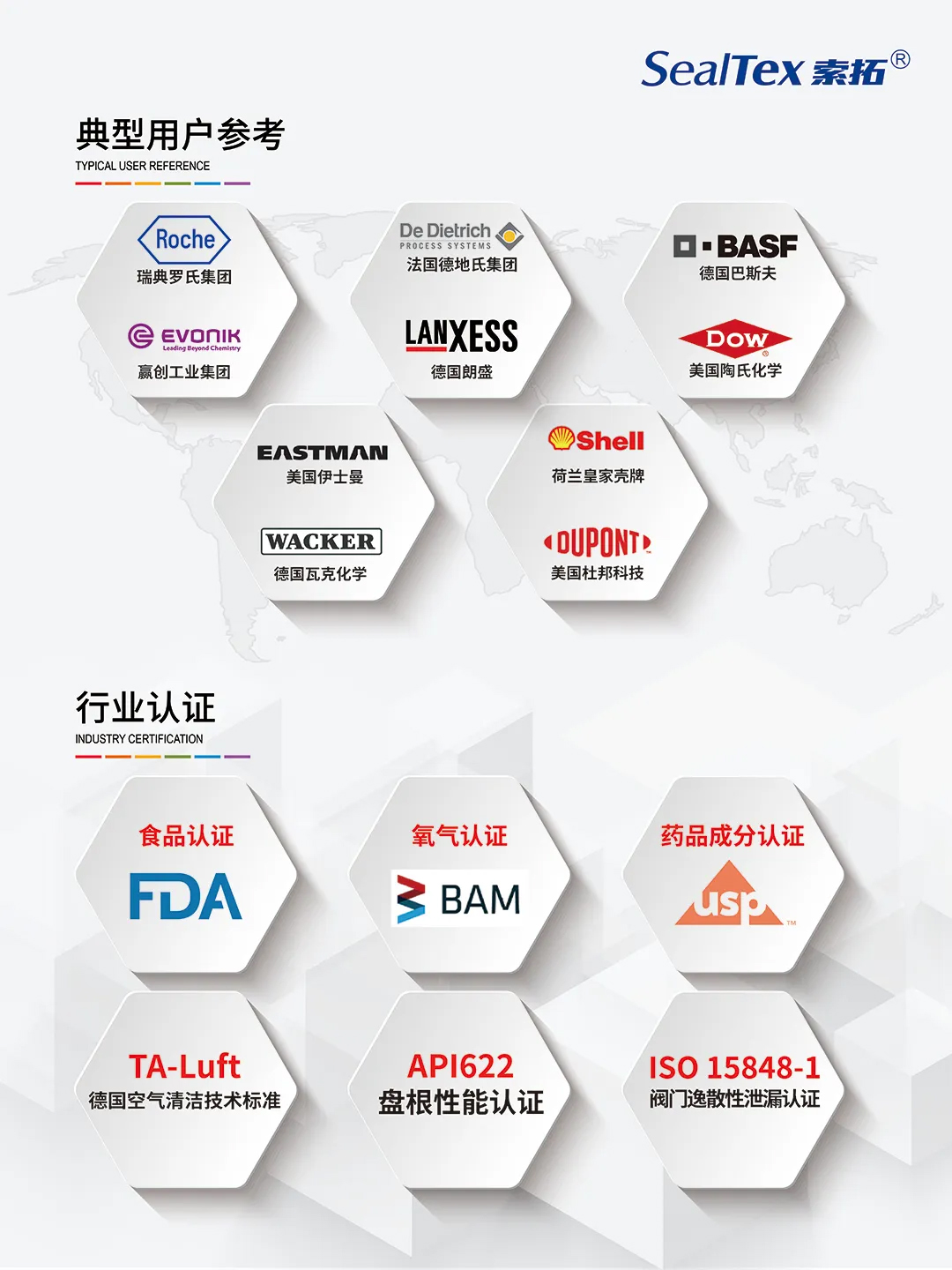我司代理合作品牌TEADIT泰迪已為全球多家知名化工企業(yè)提供密封解決方案服務(wù),例如:BASF巴斯夫、Shell殼牌、Roche羅氏等。且產(chǎn)品可滿足FDA、BAM、DVGW、ups、TA-Luft、API622、ISO 15848-1等不同標(biāo)準(zhǔn)要求。還在耐高溫、耐腐蝕等性能上表現(xiàn)出色,能夠滿足天然氣、石油、化工等嚴(yán)苛工況下的密封需求
